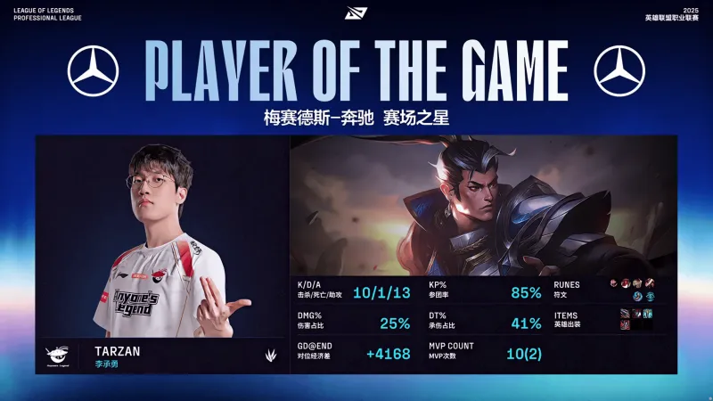 虎扑09月12日讯 在刚刚结束的LPL第三赛段季后赛AL对阵NIP比赛中,Tarzan赵信打出10/1/13战绩,拿下AL对阵NIP第四局MVP,这是他第10个MVP,也是他季后赛第2个MVP。