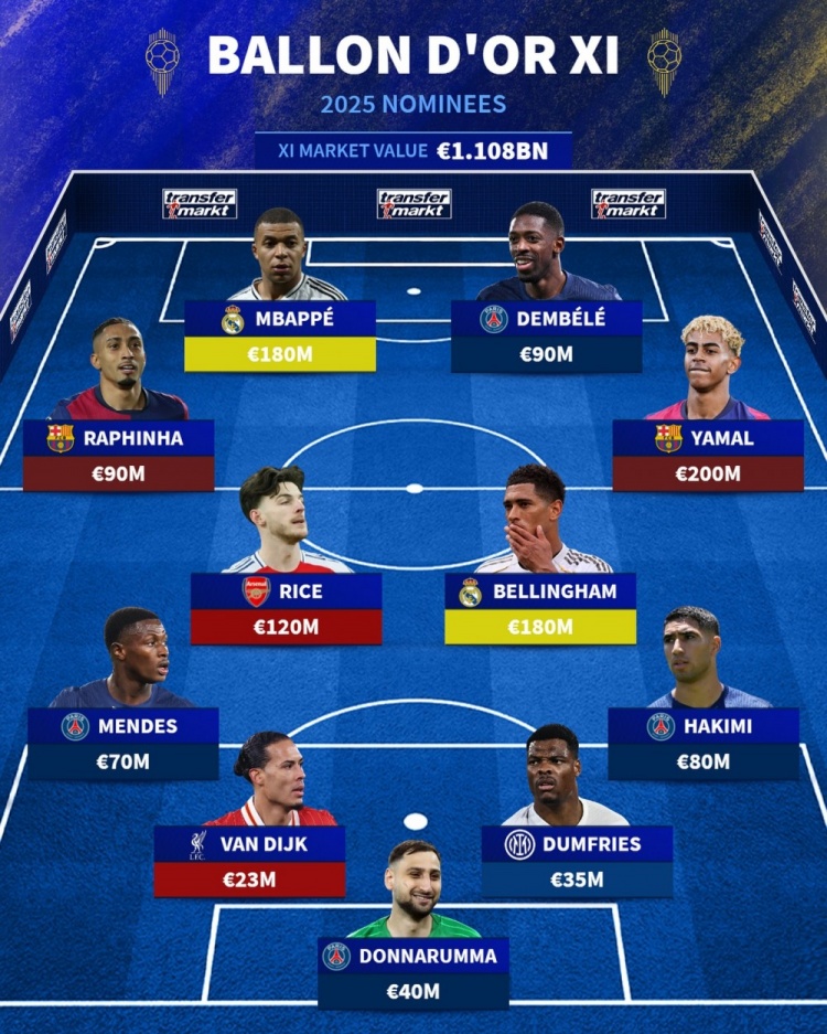 德转列金球候选阵容:登贝莱、姆巴佩、亚马尔在列,总价超11亿欧